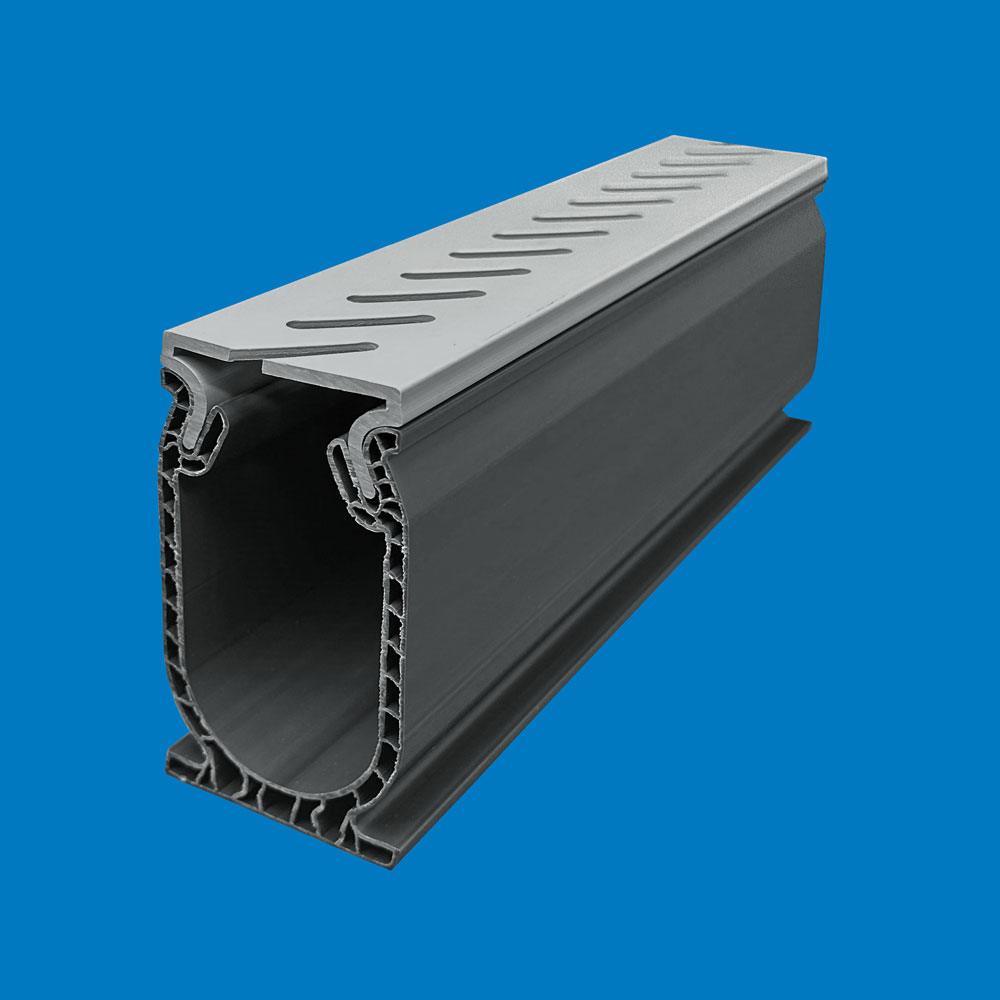 F. NOTE: Concrete must be edged to ensure future top cap removal. The fittings (90 degree, 45 degree, etc.) are supplied as “base only”. During installation, the top caps (10 ft. long) run continuously over the fittings serving as a mounting device, leaving the fittings virtually invisible.